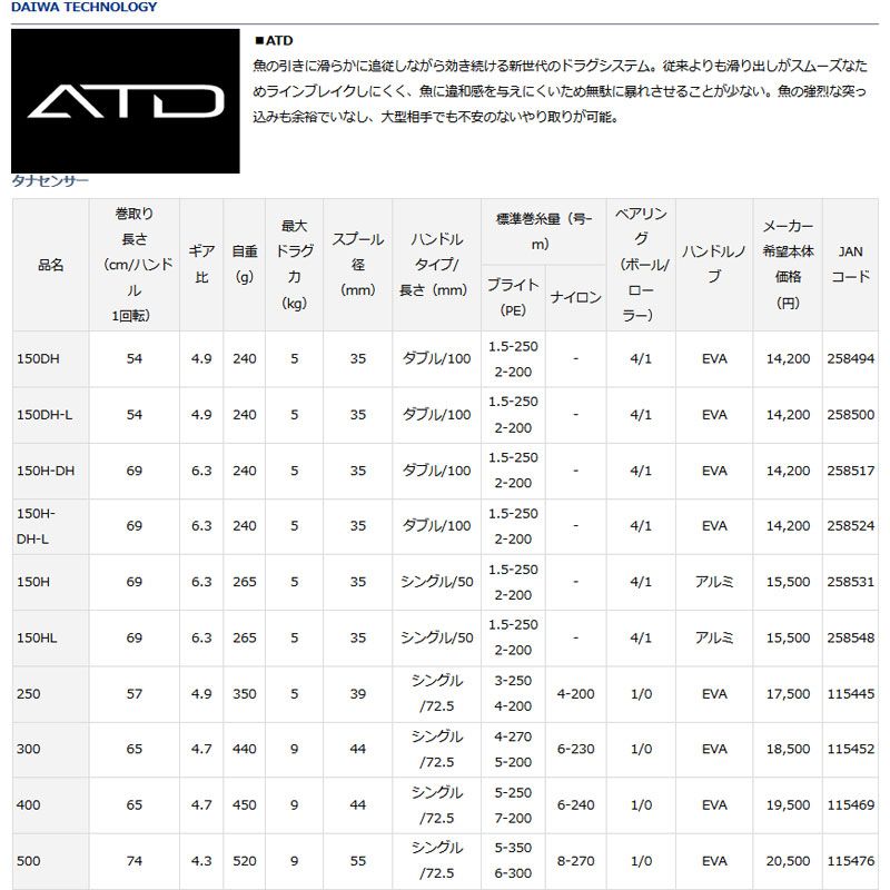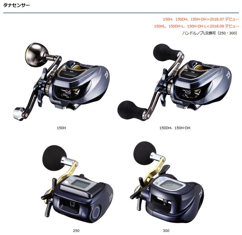 300〜500 :クラッチOFF時にレベルワインドが連動するシンクロレベルワインド構造搭載機能・仕様一覧機能/品名:150DH:150DH-L:150H-DH:150H-DH-L:150H:150HL:250:300:400:500スーパーメタルフレーム :● :● :● :● :● :● :- :- :- :-ワンプッシュONクラッチ :● :● :● :● :● :● :- :- :- :-早技クラッチ(棚クラッチ) :- :- :- :- :- :- :● :- :- :-EVAノブ :● :● :● :● :- :- :● :● :● :●バランサー付き&大型アルミラウンドノブ :- :- :- :- :● :● :- :- :- :-コマセタイマー :- :- :- :- :- :- :● :● :● :●釣れタナメモリー :- :- :- :- :- :- :- :● :● :●ATD :- :- :- :- :- :- :● :● :● :●シンクロレベルワインド :- :- :- :- :- :- :- :● :● :●ツマランボディ :● :● :● :● :● :● :- :● :● :●電池交換可能 :*1 :*1 :*1 :*1 :*1 :*1 :● :● :● :●スーパースプールフリー :● :● :● :● :● :● :- :- :- :-ラインストッパー :● :● :● :● :● :● :- :- :- :-*1 … 電池交換は作業が複雑なため防水性能を考慮しアフターサービス預かりになります。